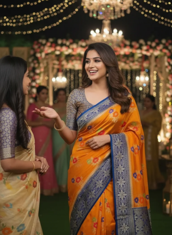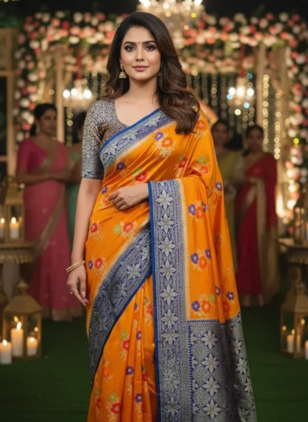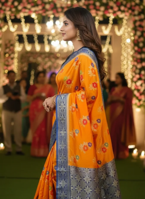Work –  Meenakari and Golden zari Woven Design all over saree