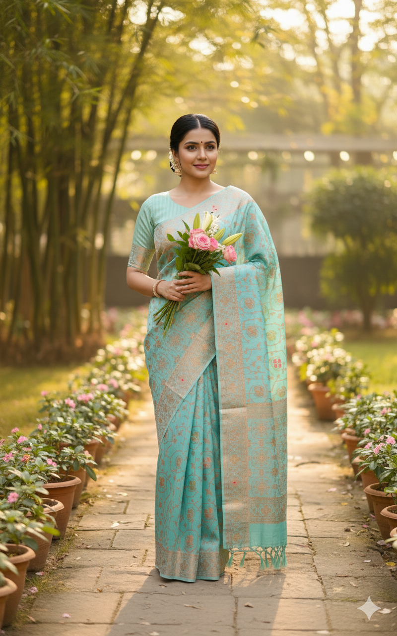 Work – Copper Zari with Little Bit Minakari Weaving all over saree